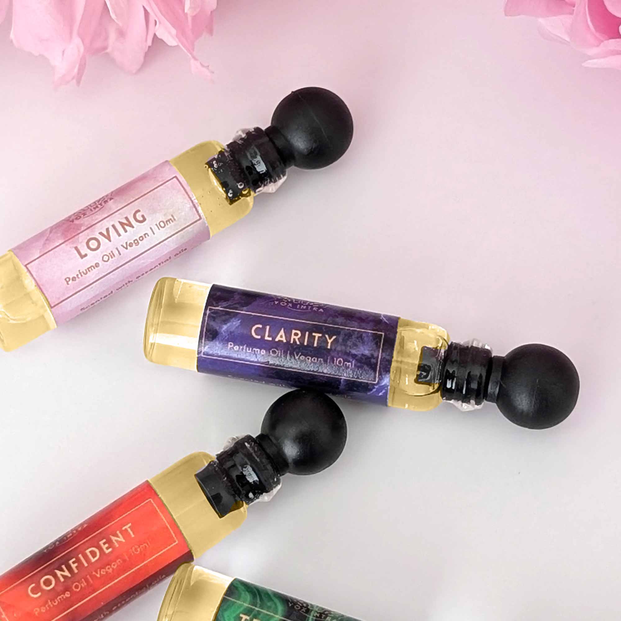 Our "Clarity" natural perfume oil is a minty floral medley that's both soft, soothing, and delicate. Notes of refreshing mint are layered over a bed of jasmine. Herbals like clary sage and lavender round out the mixture for a fresh and delicate aroma.