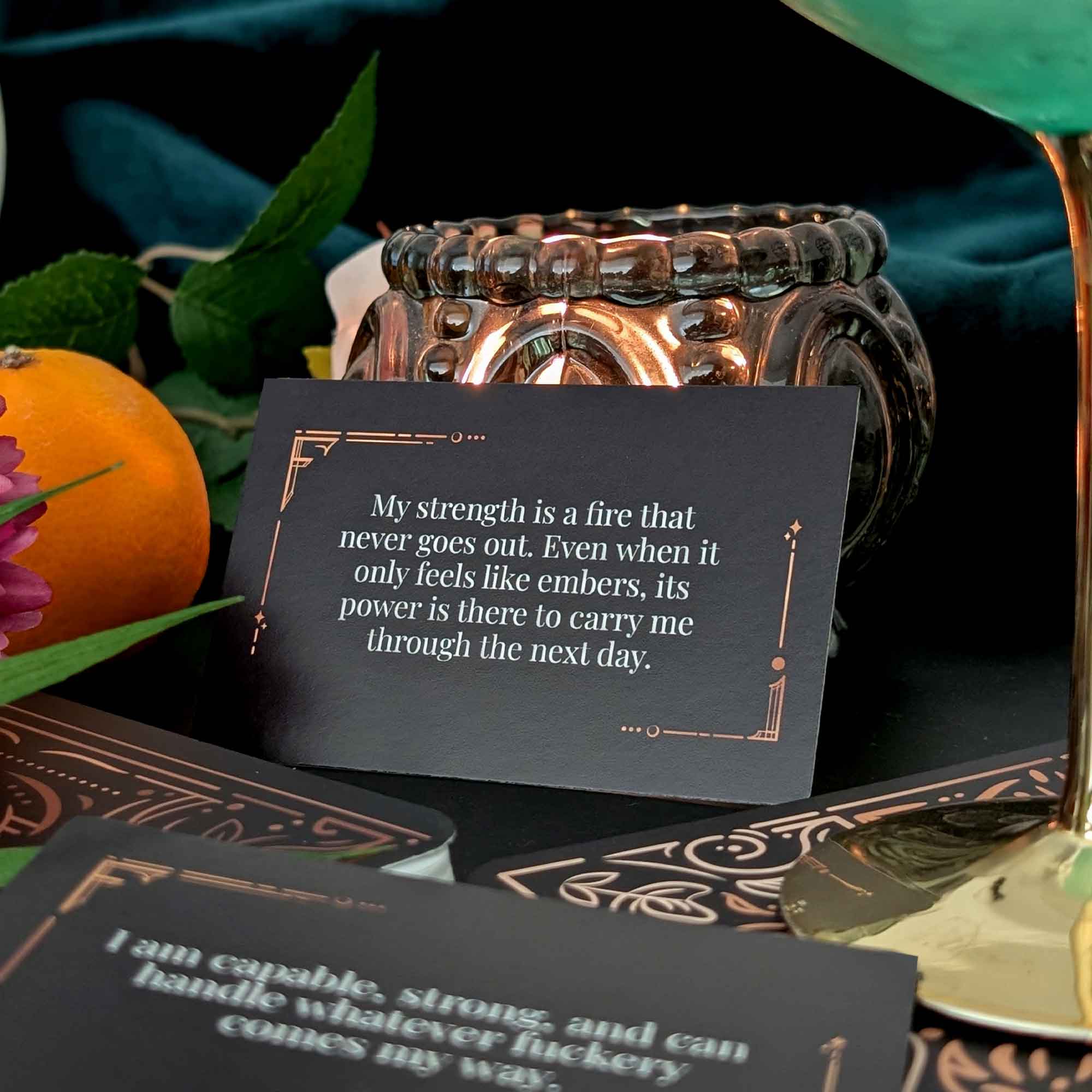 Each card has a comical or uplifting affirmation or reflection that I've written to help you laugh, say “fvck it”, and find some peace.