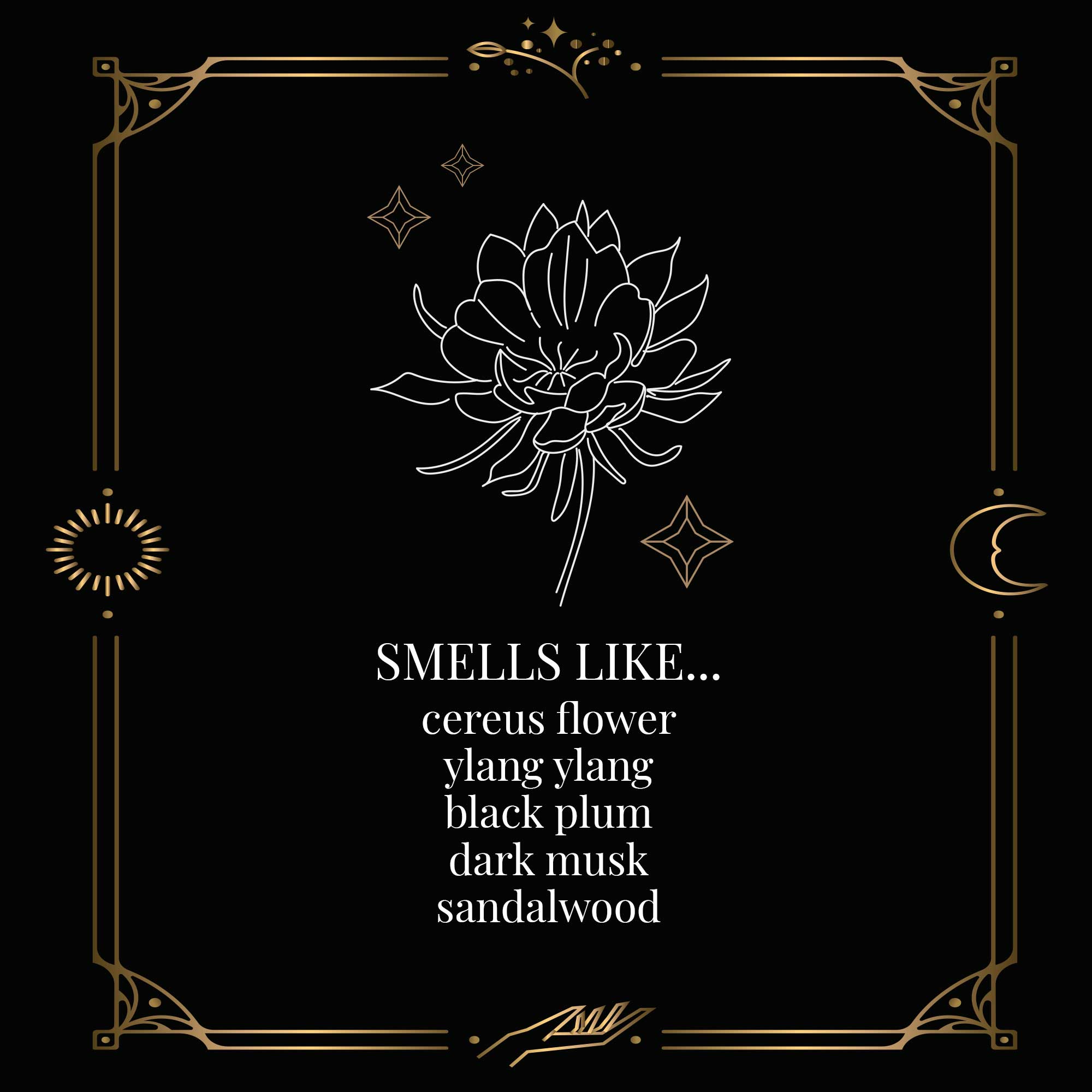 An intoxicating scent designed for those prepared to step into their power. A sweet, inky, lush and musky floral that’s complex but not overwhelming.